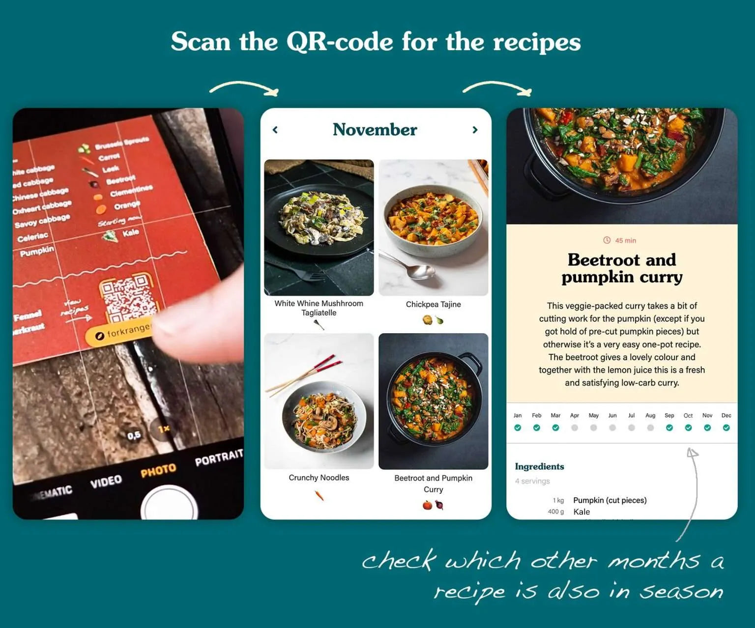 - 48 einfache und leckere saisonale Rezepte online oder in der App, 4 pro Monat