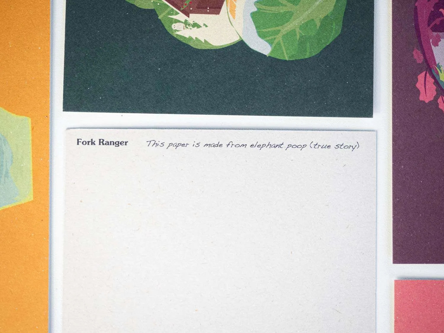 Deze kaarten worden gemaakt van speciaal papier: papier van olifantenpoep. Geen zorgen, je ruikt niks. We hebben dit papier gekozen omdat het duurzaam is en natuurlijk aanvoelt.