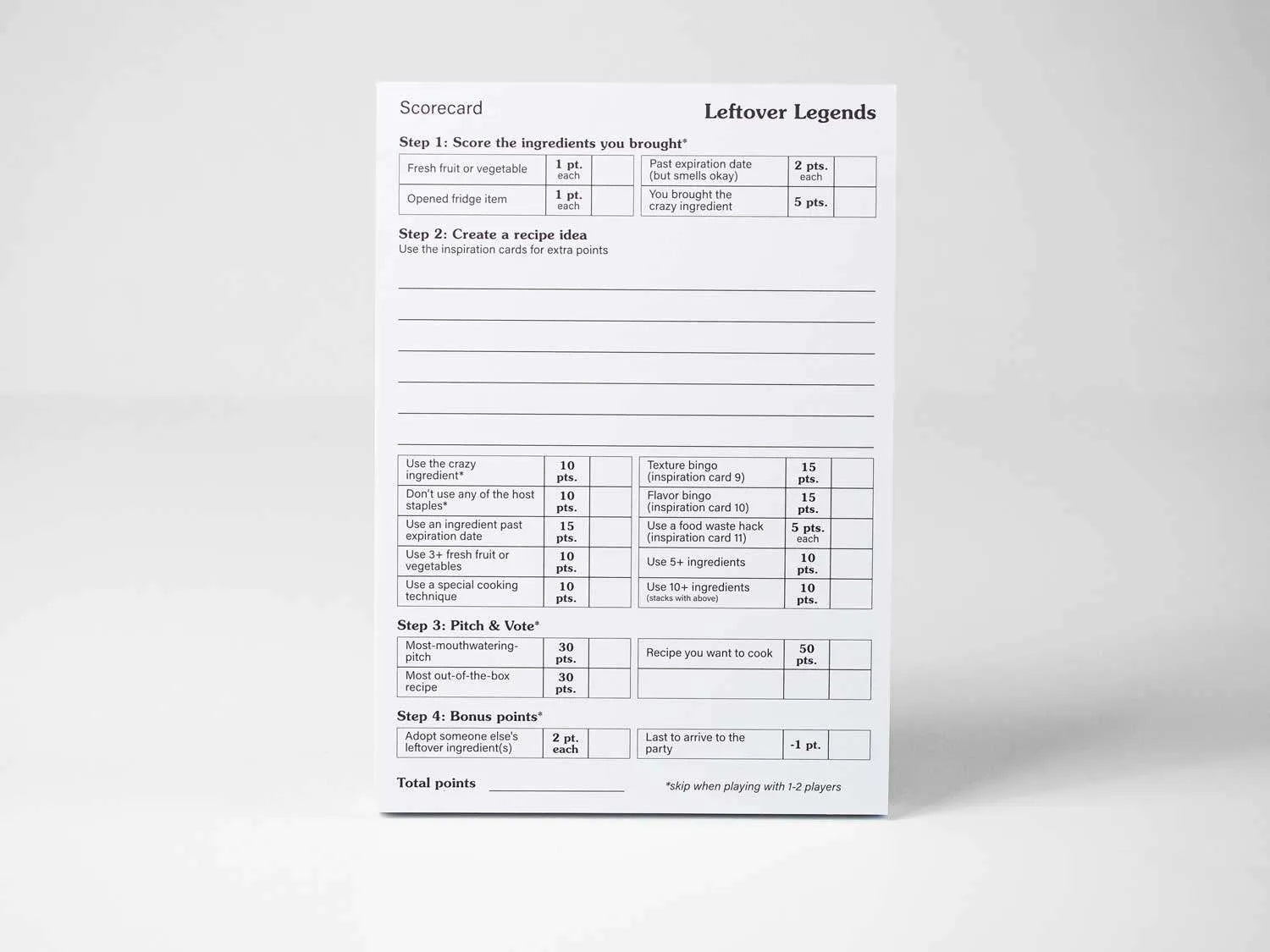 Als je het belangrijker vindt met je vrienden een gezellige tijd te hebben en jullie jezelf niet als spelletjesliefhebbers zouden beschrijven: speel dan gewoon de simpele versie. Nodig je vrienden uit om leftover ingrediënten mee te nemen, bedenk receptideeën met de inspiratiekaarten van het spel en kook een heerlijke maaltijd samen! Maar maak je niet druk over het punten systeem en het pitchen.